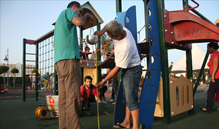 En la secuencia de fotografías anterior un peso conectado a un equipo informático se deja caer a una cierta altura simulando la posible caída de un niño/a en una zona específica. Los datos del impacto son recogidos y analizados por un aparato y un software informático especializados que contrastan los datos generados de acuerdo a los requisitos generales y específicos de idoneidad a la absorción de impactos que establece la normativa UNE-EN 1177:2008.