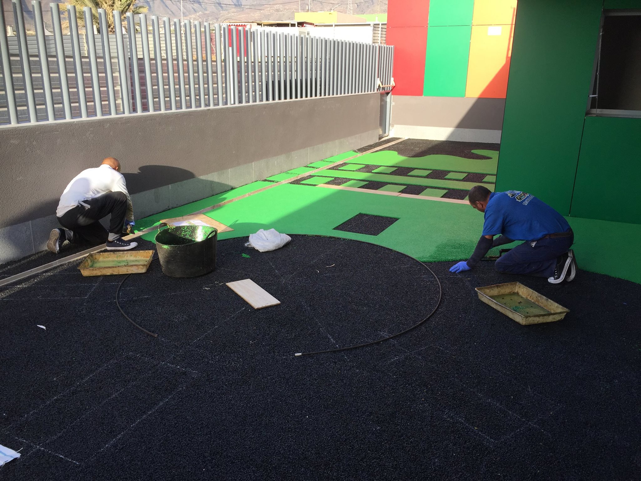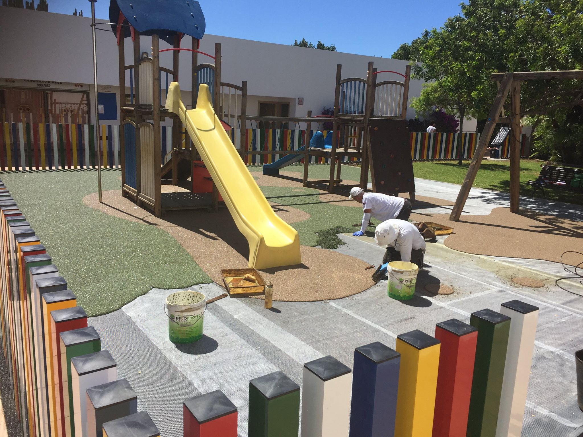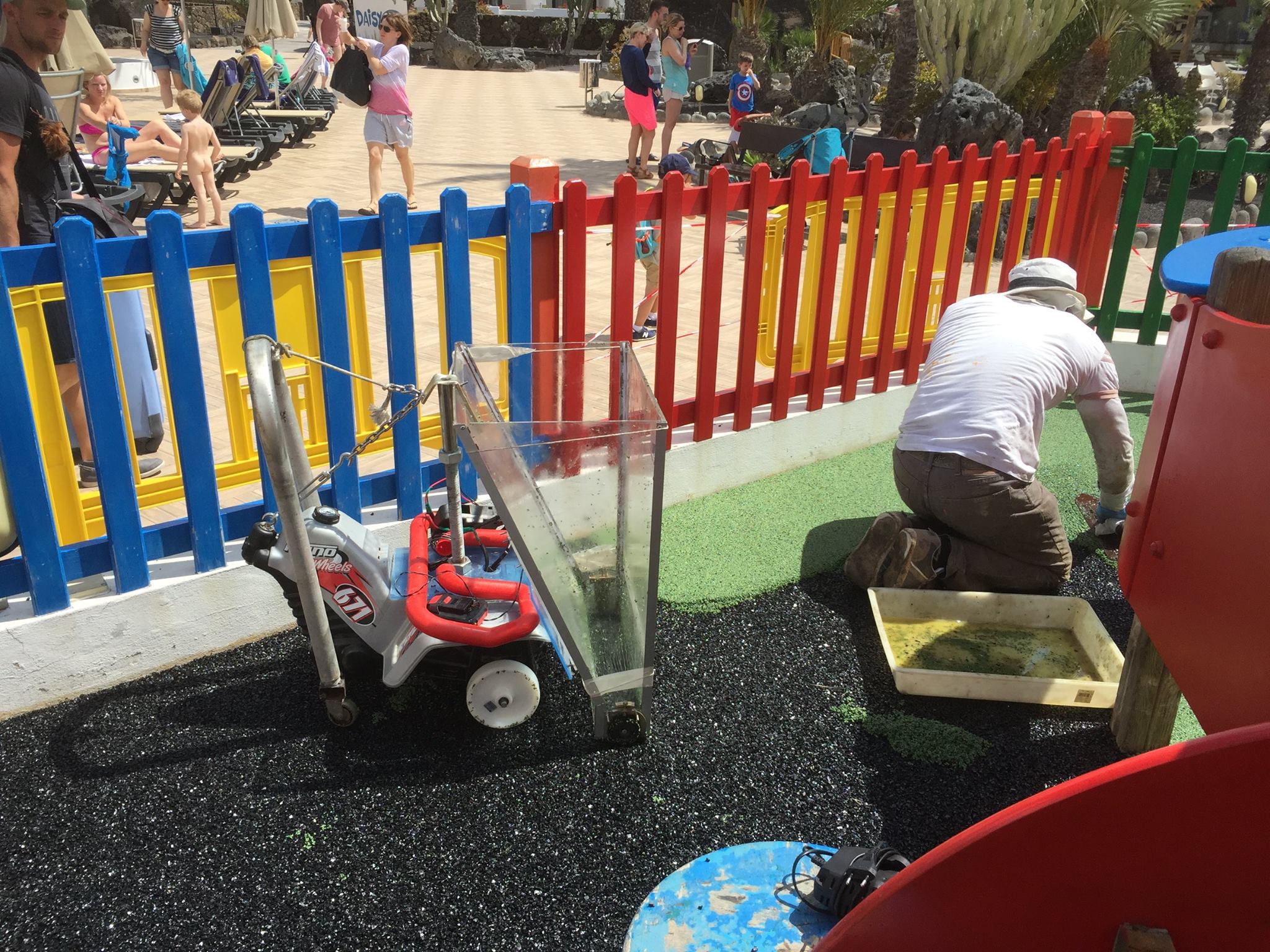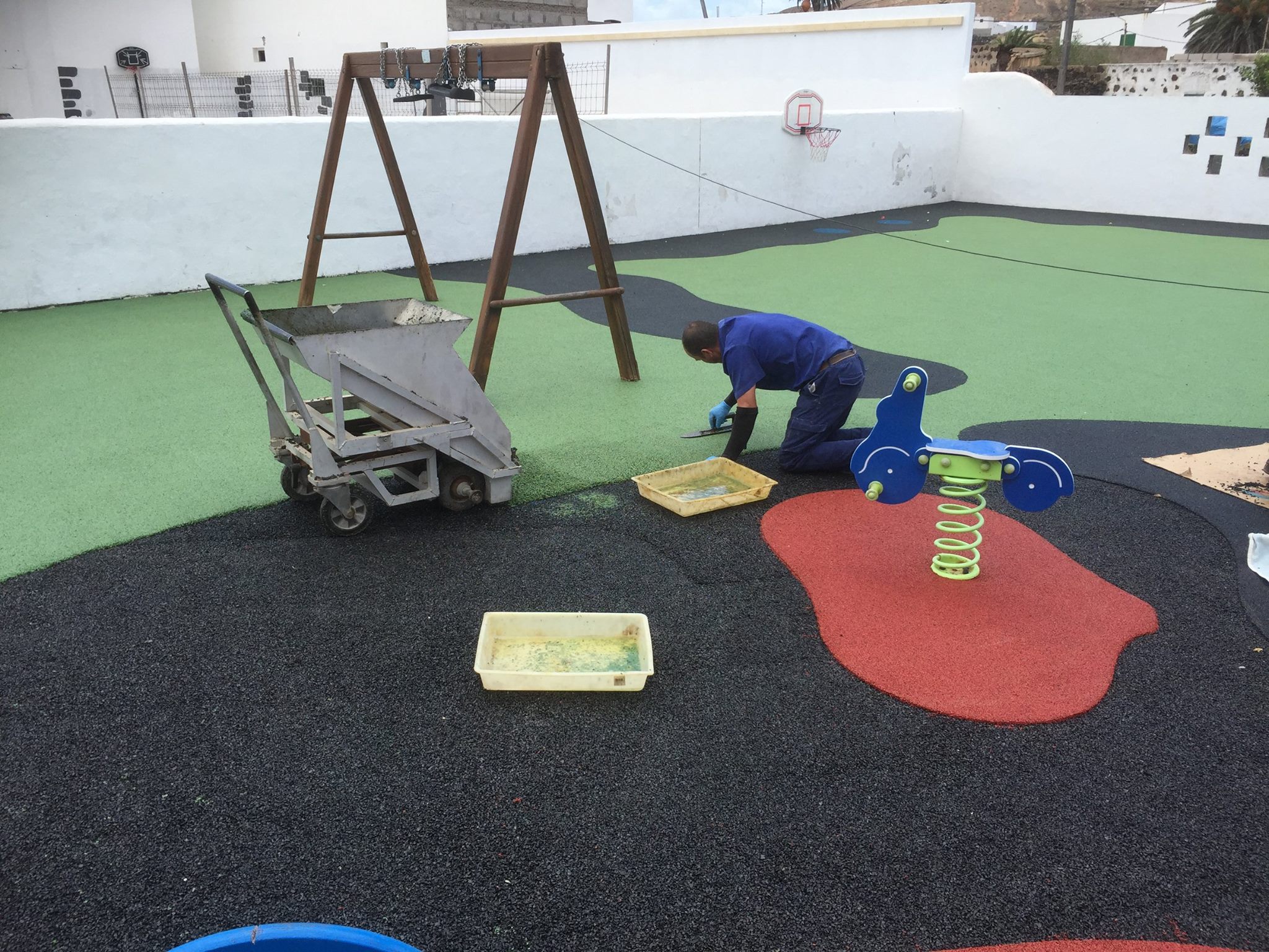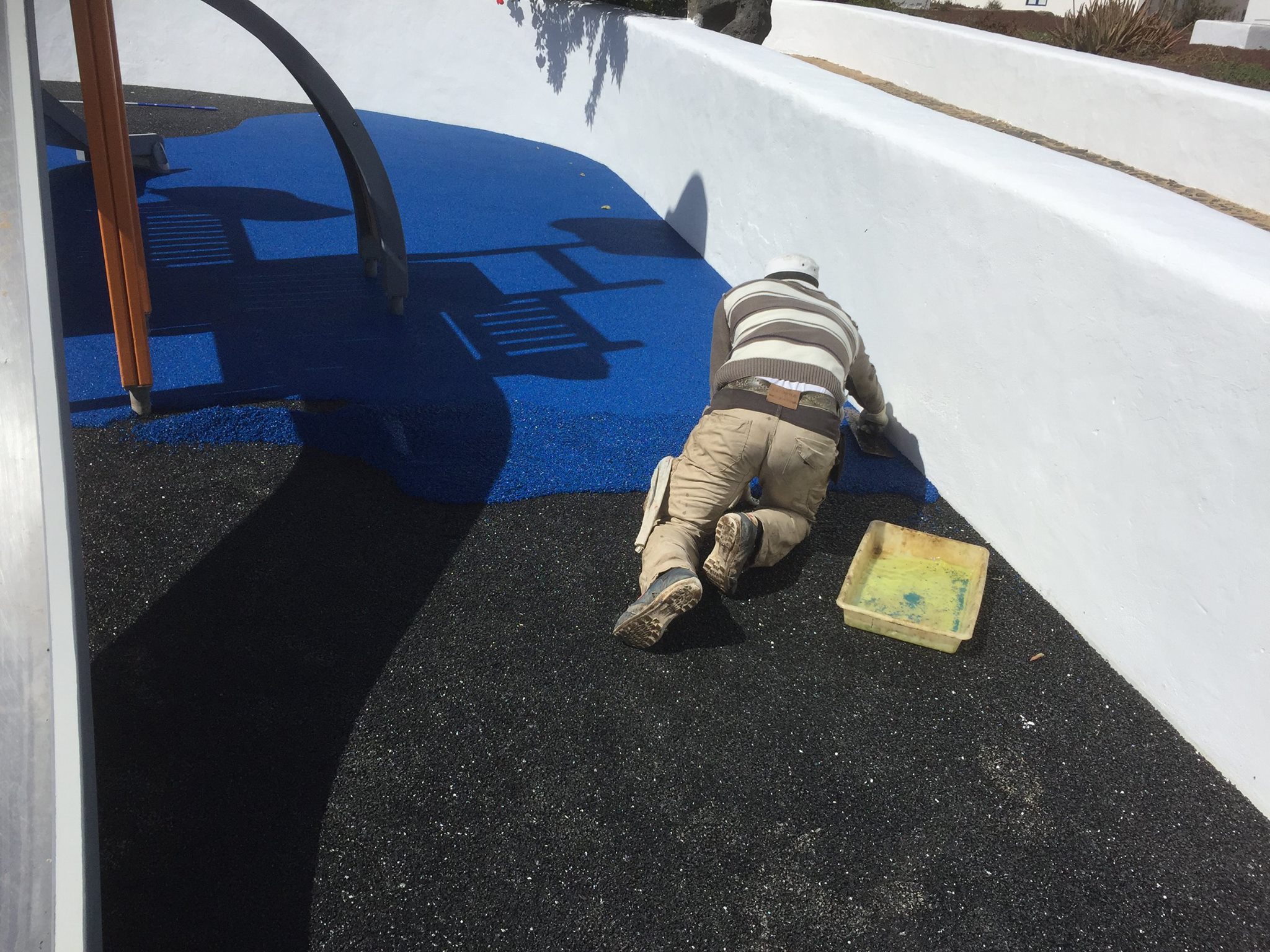 Una de nuestras especialidades es la colocación de pavimento amortiguador tanto en losetas como en pavimento continuo, siempre cumpliendo con la normativa vigente en (UNE-EN 1176-7:2008).
